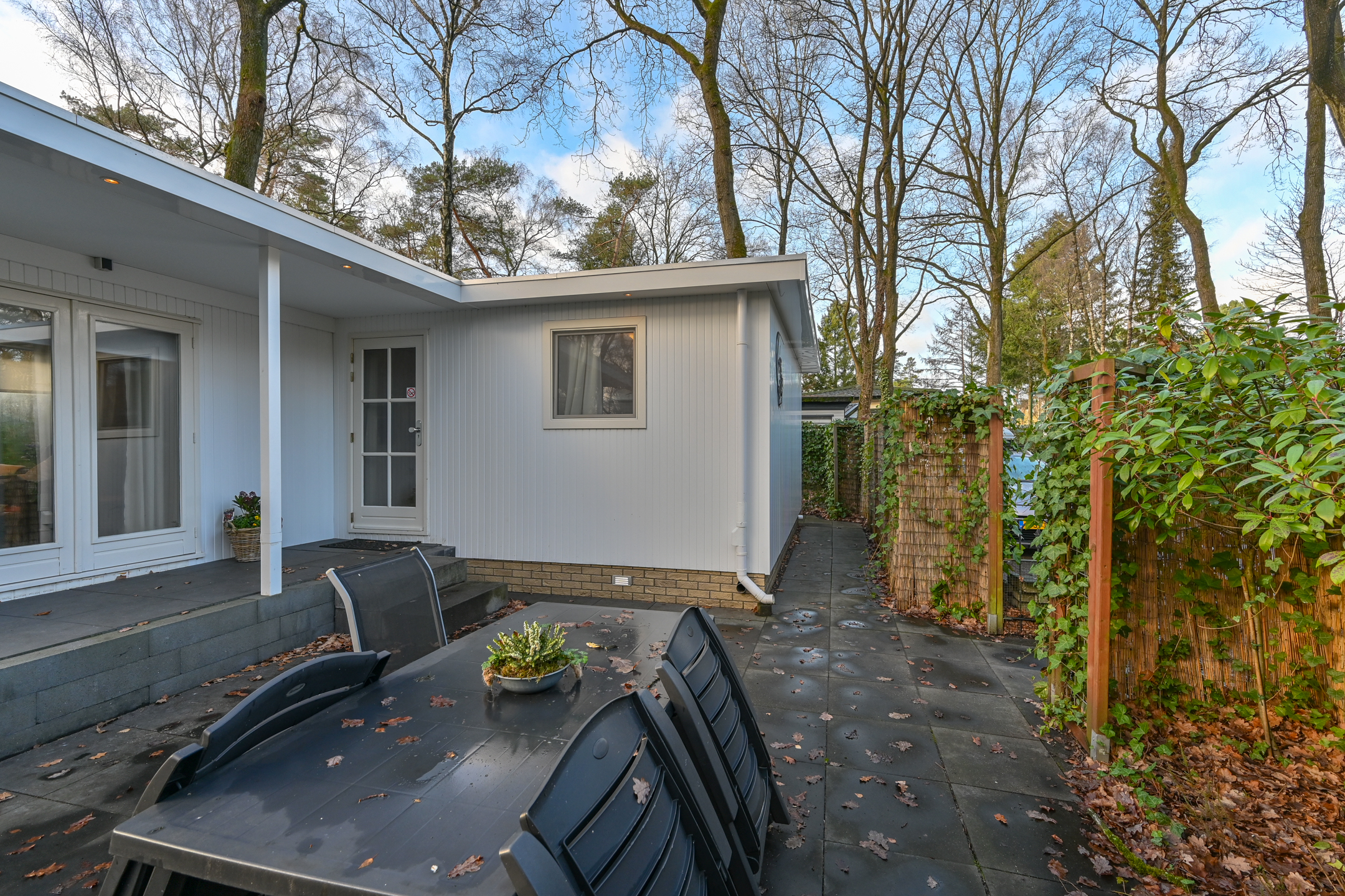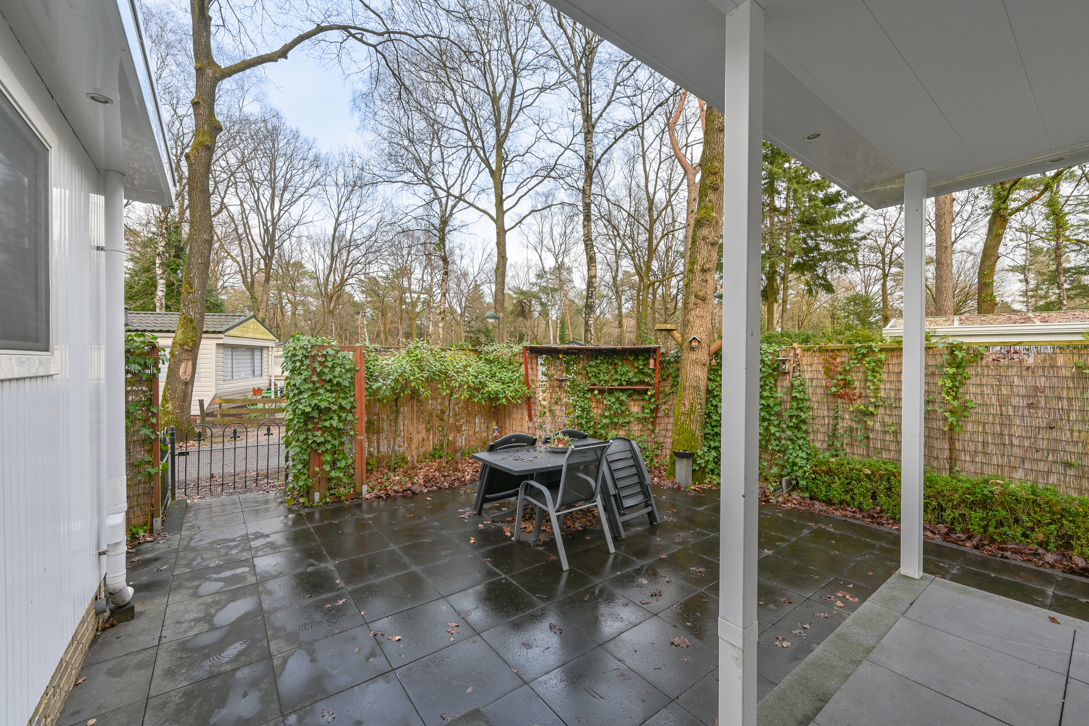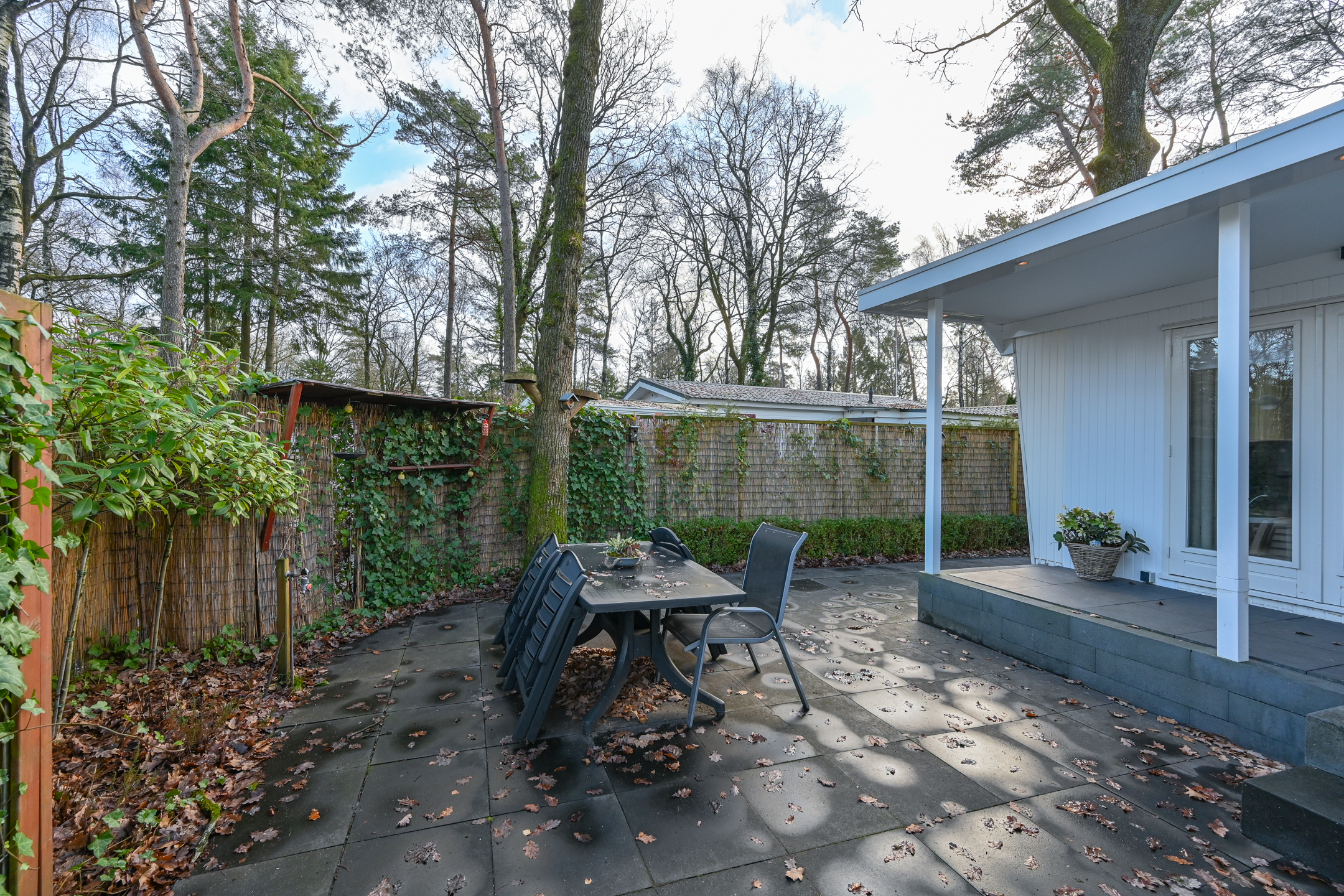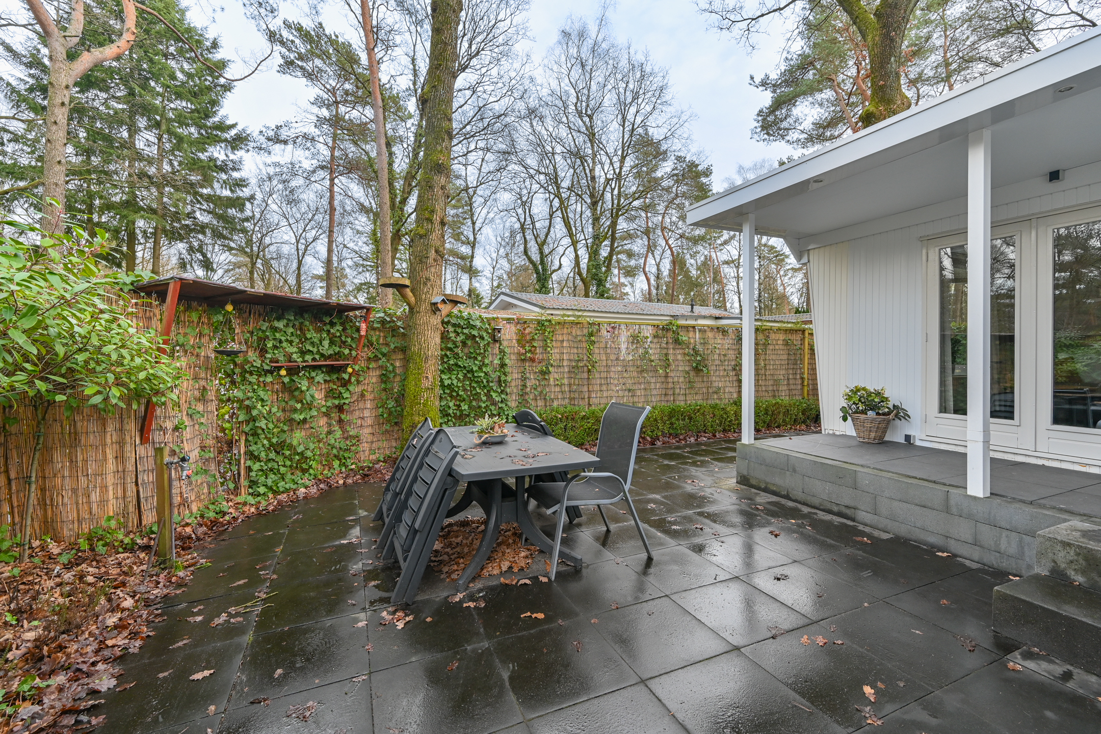 In de tuin staat een tuintafel met 4 stoelen om in de zomermaanden lekker buiten te kunnen eten. De tuin is afgeschermd met bamboe en klimplanten waardoor er genoeg privacy is.
