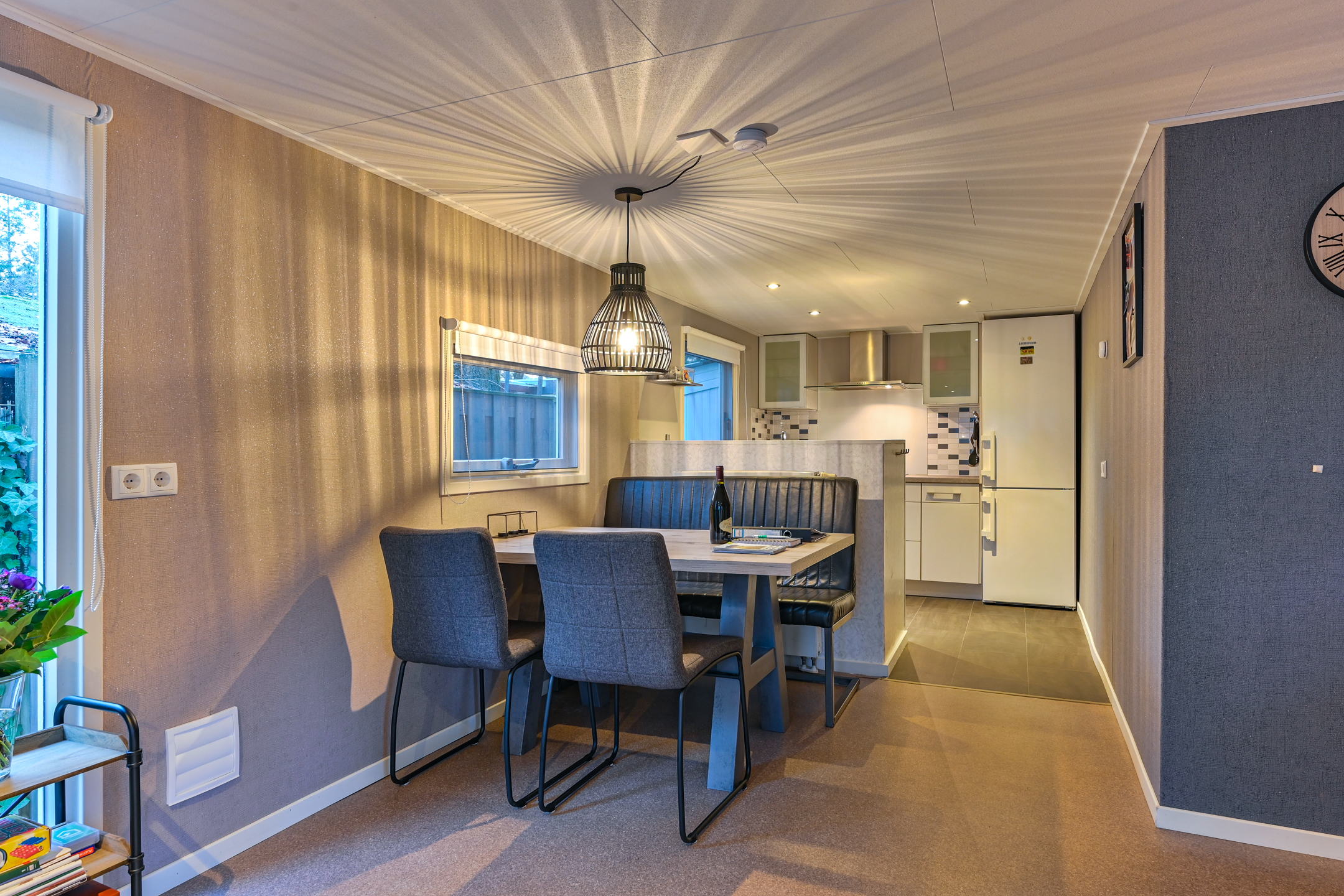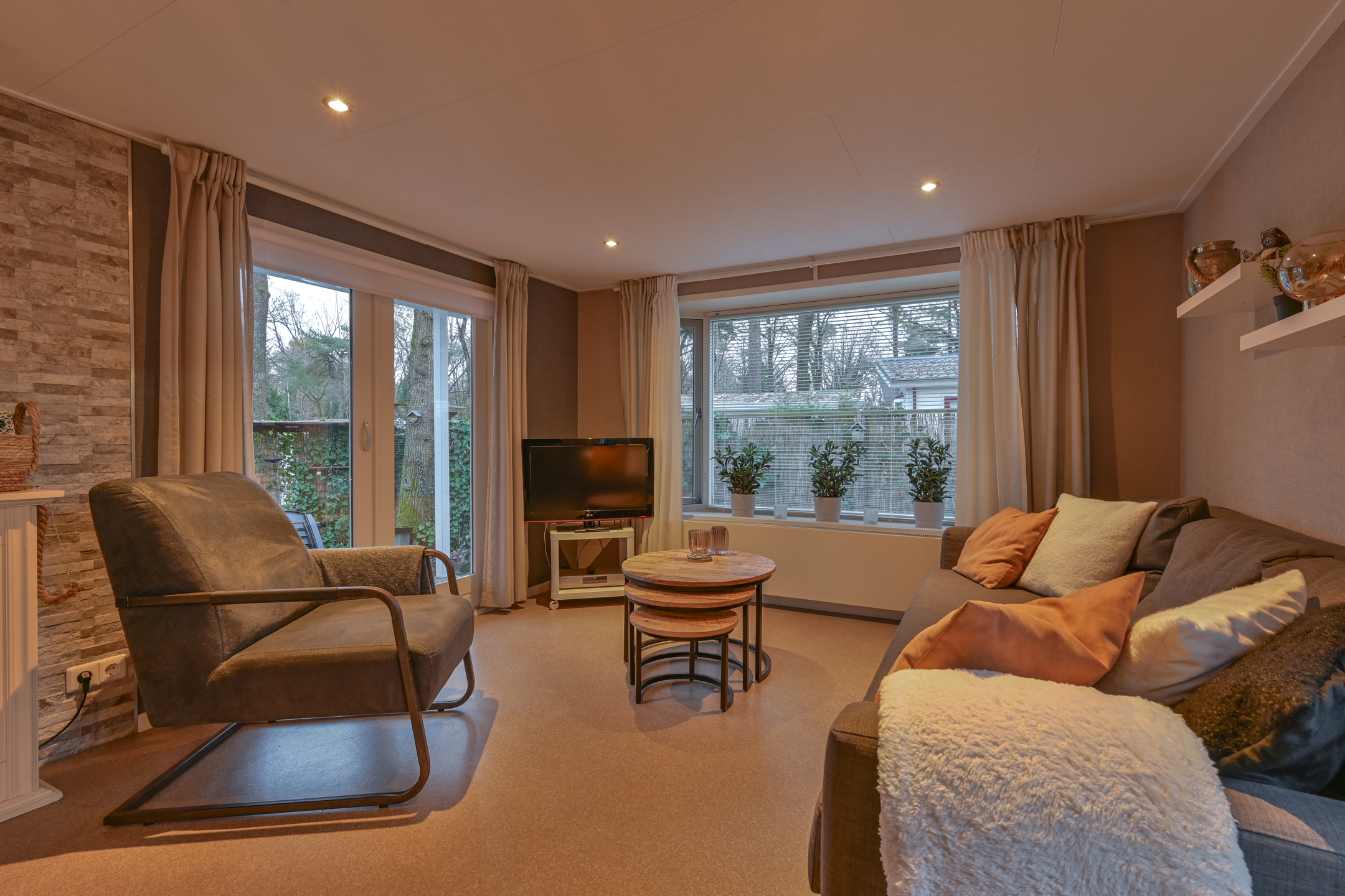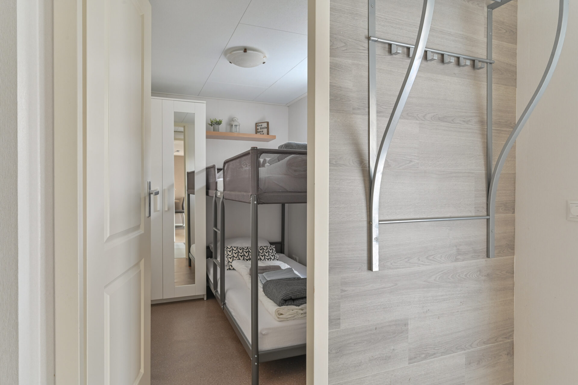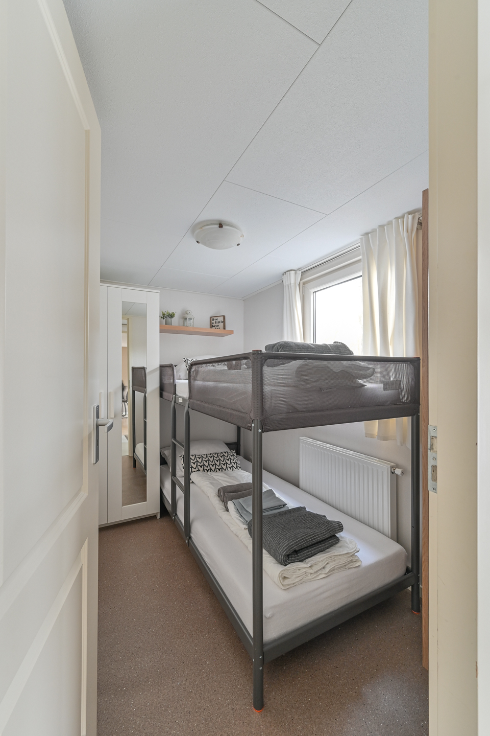 Binnen is een sfeervolle ruime woonkamer en keuken met alles erop en eraan. vanuit de hal met kapstok bereikbaar; toilet badkamer met douchecabine en wastafel meubel, ruime slaapkamer met (160 x 200) met grote kledingkast en 2e slaapkamer met stapelbed en kledingkast.