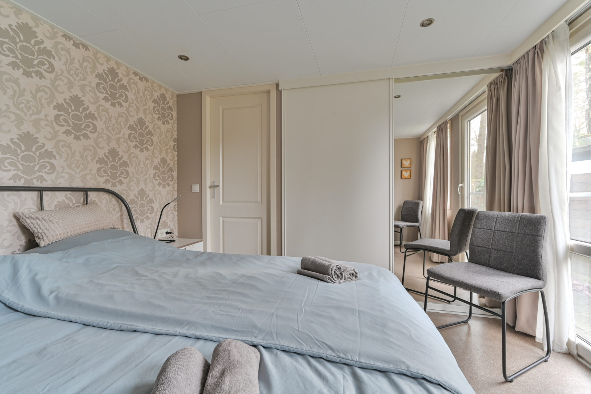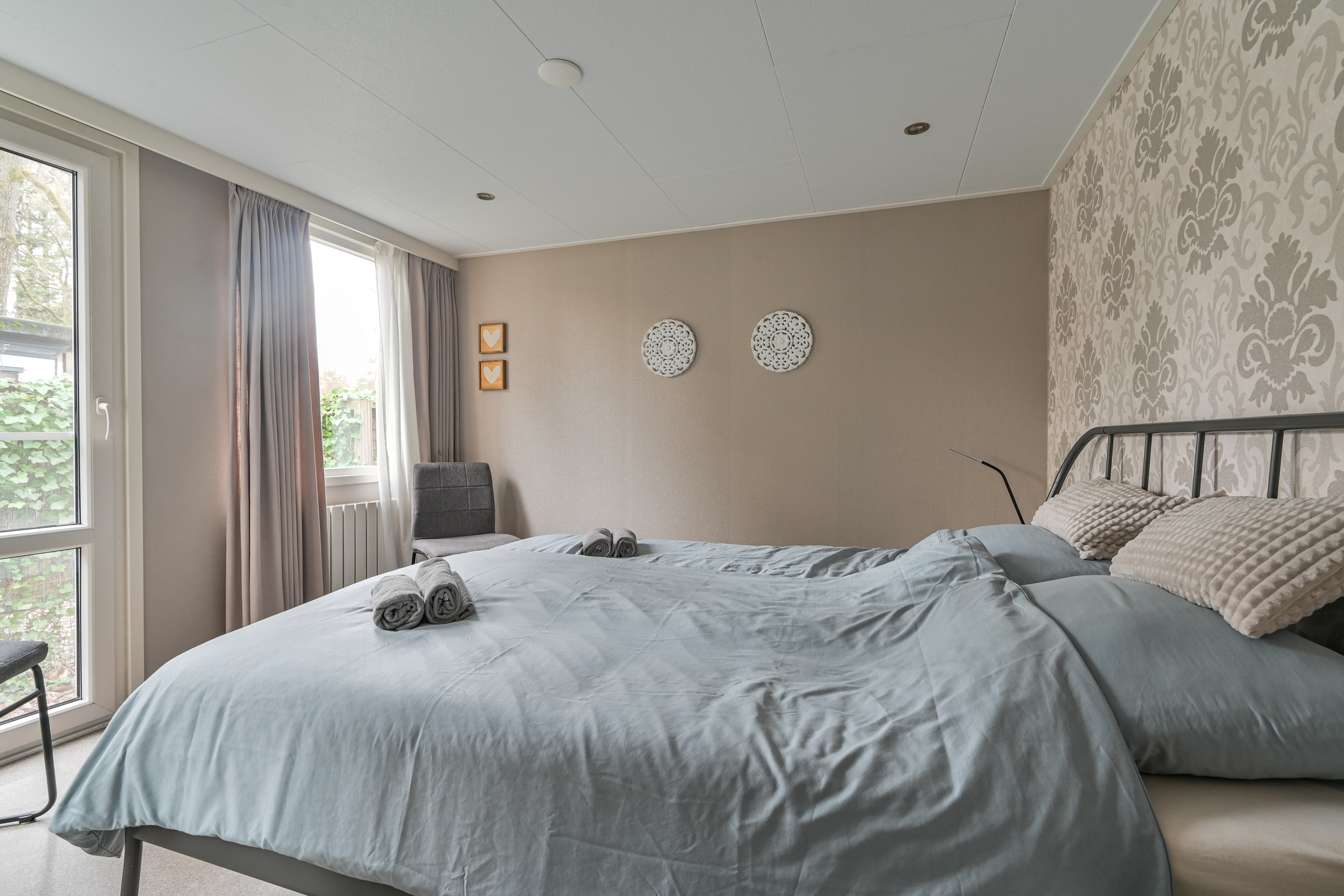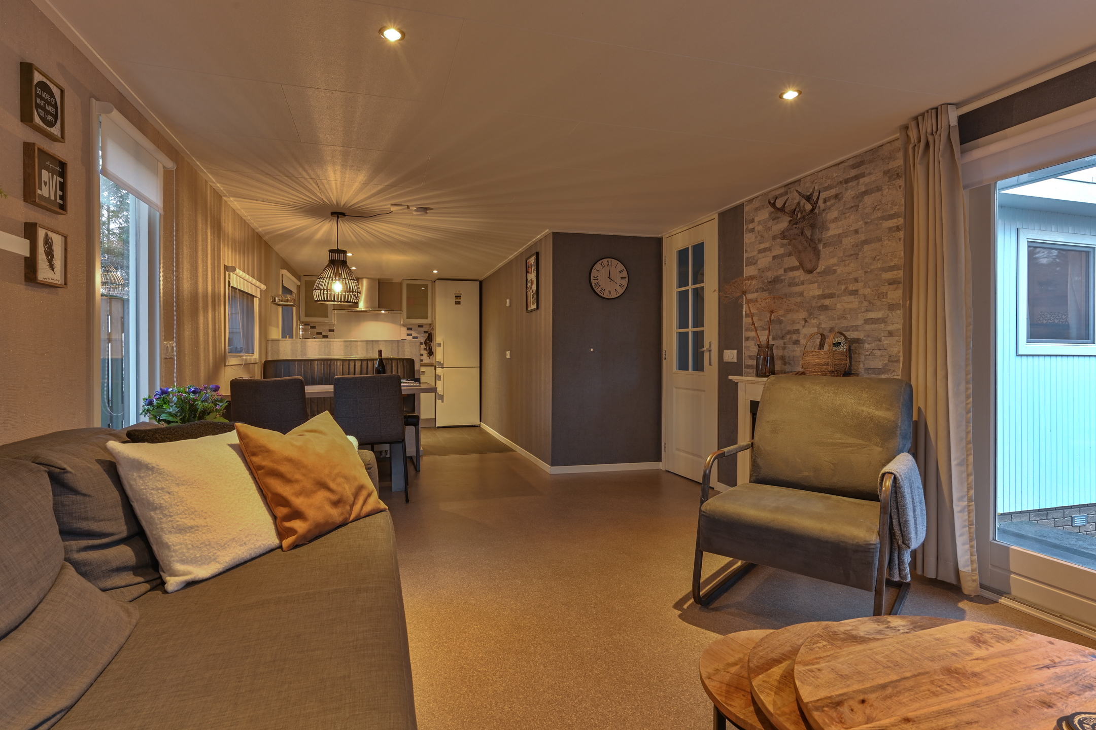 Het Chalet biedt een ruime comfortabele woonkamer met open keuken! 2 slaapkamers, Badkamer met wandmeubel, douchecabine, wasmachine & droger. Het toilet is apart van de badkamer. Als je de camping afloopt (op verschillende plekken mogelijk) sta je direct in het bos en mooie heidevelden waar je vogels, eekhoorntjes, herten, en zwijnen tegen kan komen! Er zijn vele wandel- en fietspaden.